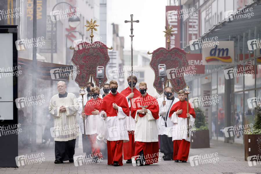 Religion, Glaube, Prozession, Messe, Gott, Gottesfurcht, Katholizismus, katholisch, Christen, Christentum, Kölner Dom, Prozession, Fronleichnam, Fronleichnamsprozession, Umzug, Weihrauch, Erzbistum Köln, Erzbischof, Hochfest, Gottesdienst, Messe, Pontifikalamt, katholische Kirche, bleibende Gegenwart Jesu Christi im Sakrament der Eucharistie, Fronleichnamsgottesdienst, Maskenpflicht, Kirche, Kirche in Zeiten von Corona, Jesus, Christus, Coronavirus, Coronakrise