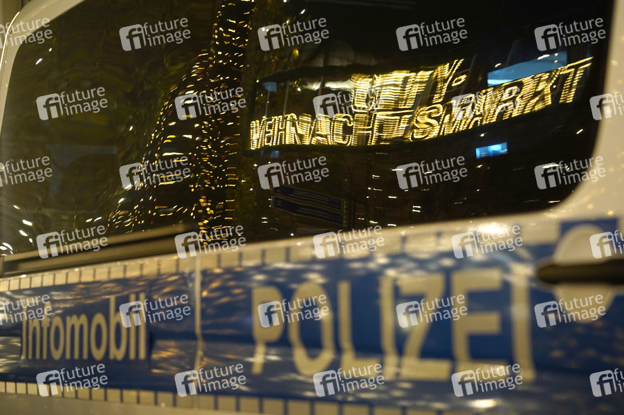Spiegelung des Weihnachsmarktschriftzugs City-Weihnachtsmarkt und eines beleuchteten Weihnachtsbaums mit dem Informobil der Polizei auf dem 39. Weihnachtsmarkt an der Gedächtniskirche am Breitscheidplatz. Berlin, 07.12.2022