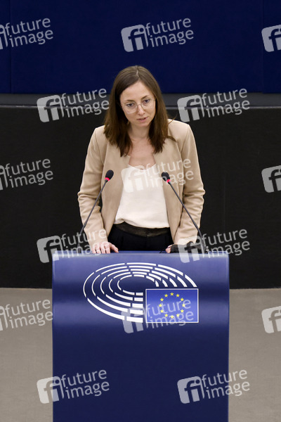 Saskia Bricmont im Plenarsaal des Europäischen Parlaments. Straßburg, 10.03.2022