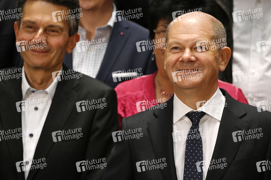 Rolf Mützenich und Olaf Scholz beim Bildtermin mit der neuen SPD Fraktion auf der Fraktionsebene im Reichstagsgebäude. Berlin, 29.09.2021