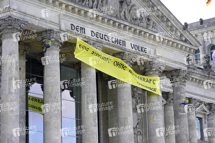 Umwelt-Aktivisten von Greenpeace protestieren mit einem Transparent 'Eine Zukunft ohne Kohlekraft' an der Fassade des Reichstagsgebäudes gegen das Kohleausstiegsgesetz. Sie fordern einen schnelleren Ausstieg aus fossilen Brennstoffen. Berlin, 03.07.2020