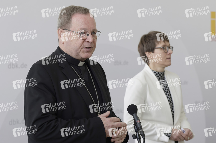Georg Bätzing und Beate Gilles beim Pressestatement zur Wahl von Heiner Wilmer SCJ zum neuen Vorsitzenden der Bischofskonferenz auf der Frühjahrsvollversammlung im Burkardushaus. Würzburg, 24.02.2026