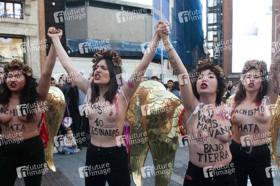 Femen Aktivistinnen bei einer Demonstration gegen Gewalt gegen Frauen am Valentinstag auf dem Plaza del Callao. Madrid, 14.02.2020