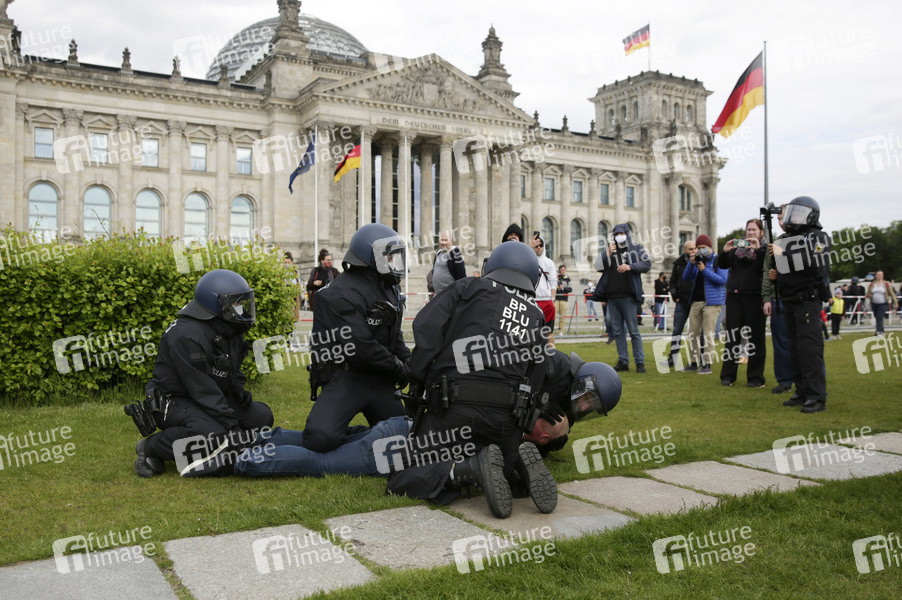 Am Rande der 'Hygienedemo' gegen die Coronamaßnahmen der Bundesregierung vor dem Reichstagsgebäude kommt es zu einigen Verhaftungen. Berlin, 16.05.2020