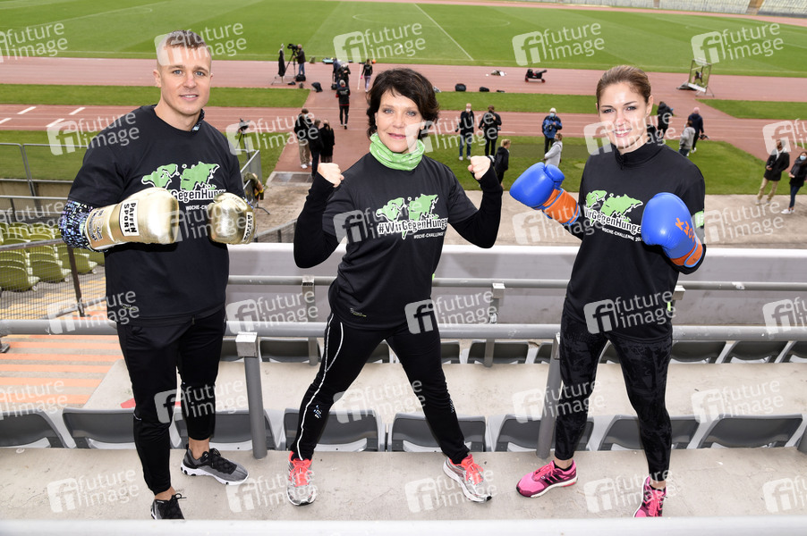 Alem Begic, Janina Hartwig und Marie Lang beim Fototermin zur sportichen '#WocheChallenge' im Olympiastation München. Unter dem Motto 'Wir können was bewegen!' ruft die Welthungerhilfe zu dieser Challenge auf und bittet um Spenden für eine Welt ohne Hunger. München, 13.10.2020