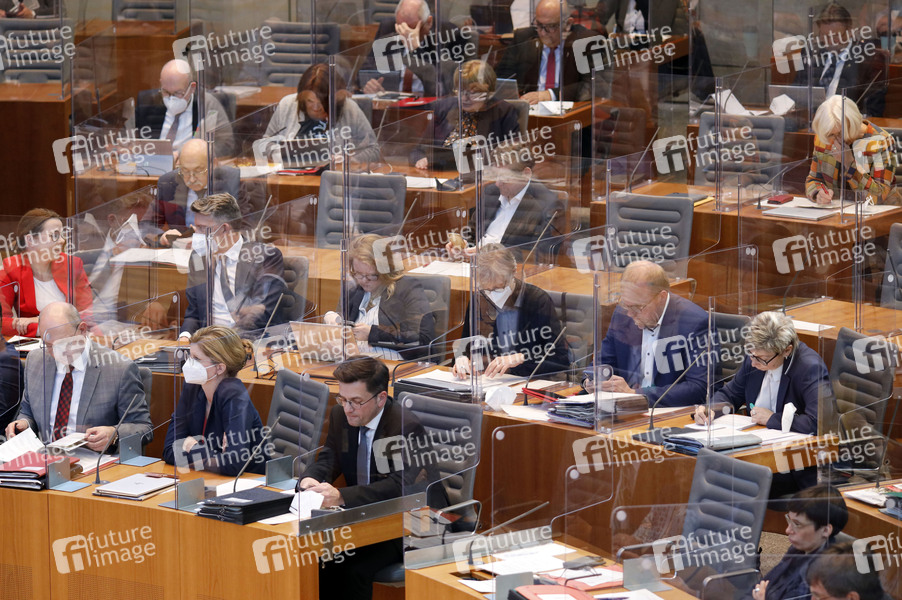 Abgeordnete getrennt durch Plexiglasscheiben bei der 125. Plenarsitzung des Landtags von NRW. Düsseldorf, 28.04.2021
