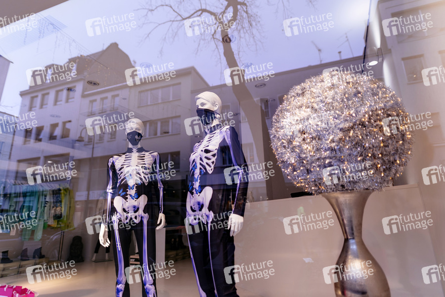 Einzelhändler auf der exklusiven Kölner Mittelstraße haben aus Protest gegen die Corona-Maßnahmen des Bundes, die sie zum Lockdown zwingen, Schaufensterpuppen zu Skeletten umgestaltet und mit Gesichtsmasken versehen. Sie fordern eine gerechtere Verteilung der Corona-Hilfspakete, eine sinnvollere Corona-Politik wie etwa eine stärkere Steuerentlastungen für den Einzelhandel oder eine Mietpreisbremse für Einzelhandelsgeschäfte. (Themenbild, Symbolbild) Köln, 11.01.2021