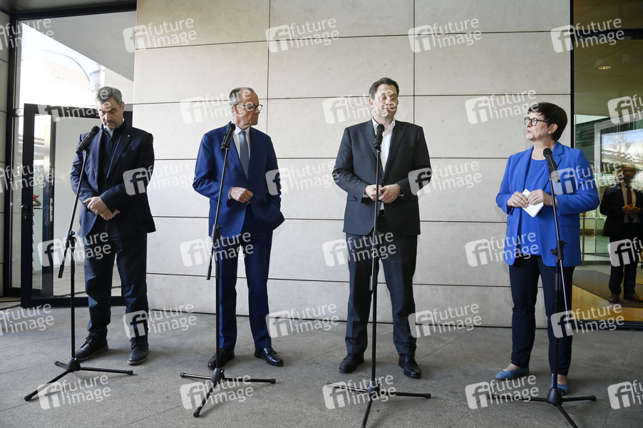 Markus Söder, Friedrich Merz, Lars Klingbeil und Saskia Esken beim gemeinsamen Auftaktstatement der Parteivorsitzenden von CDU, CSU und SPD zur Bildung einer neuen Regierungskoalition im Willy-Brandt-Haus. Berlin, 28.03.2025