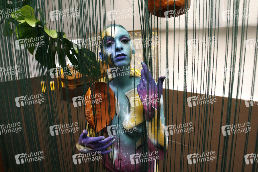 Bodypainting und Fotoshooting mit Model Sarah am Tag der offenen Tür der Meisterschule Justus-von-Liebig-Schule, Abteilung Floristik in Hannover-Ahlem. Künstler: Jörg Düsterwald