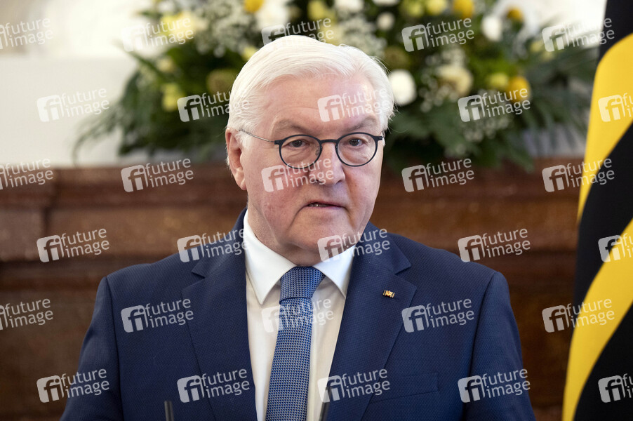 Frank-Walter Steinmeier bei der Übergabe der Wohlfahrtsmarken 2025 durch den Bundesminister der Finanzen an den Bundespräsidenten im Schloss Bellevue. Berlin, 21.02.2025