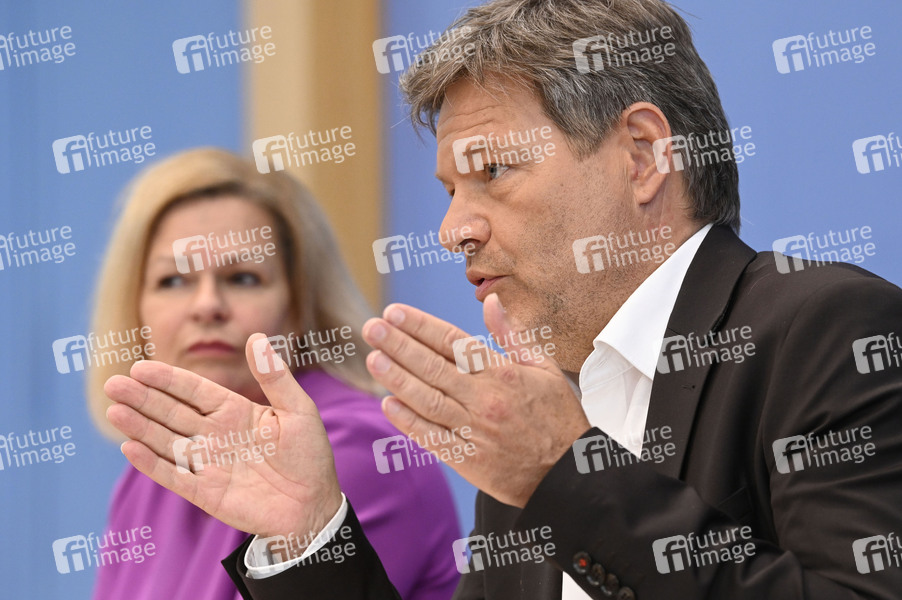 Nancy Faeser und Robert Habeck bei der Bundespressekonferenz 1. Gleichwertigkeitsbericht der Bundesregierung im Haus der Bundespressekonferenz. Berlin, 03.07.2024
