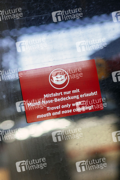 Schilder auf den Türen eines ICE weisen Bahnreisende darauf hin, dass der Zug nur mit Mund-Nase-Bedeckung betreten werden darf. In Bahnhofsgebäuden und am Gleis gilt aufgrund der Corona-Regeln ohnehin Maskenpflicht und Mindestabstand. (Themenbild, Symbolbild) Köln, 06.12.2020