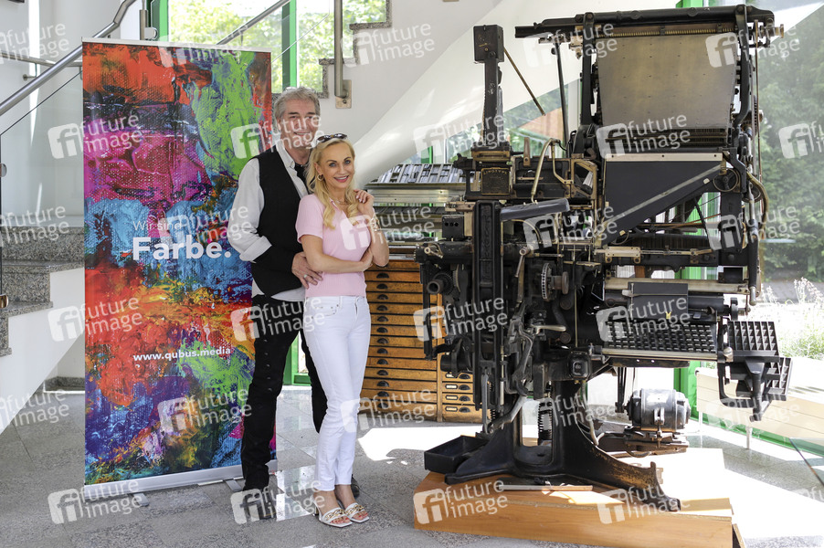 Jörg Düsterwald und Ewa Haas Stark bei der Präsentation des Düsterwald-Kalenders 'Bodypainting in Nature 2022' in der Druckerei QUBUS media. Hannover, 30.07.2021