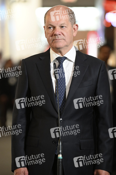 Olaf Scholz beim Pressestatement nach dem Eröffnungsrundgang auf der Hannover Messe 2022 auf dem Messegelände. Hannover, 30.05.2022