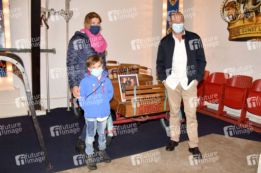 Heino Ferch mit Ehefrau Marie-Jeanette und Sohn Gustav Theo Cian beim Presserundgang auf der Circus Krone-Farm. Weßling, 29.06.2020
