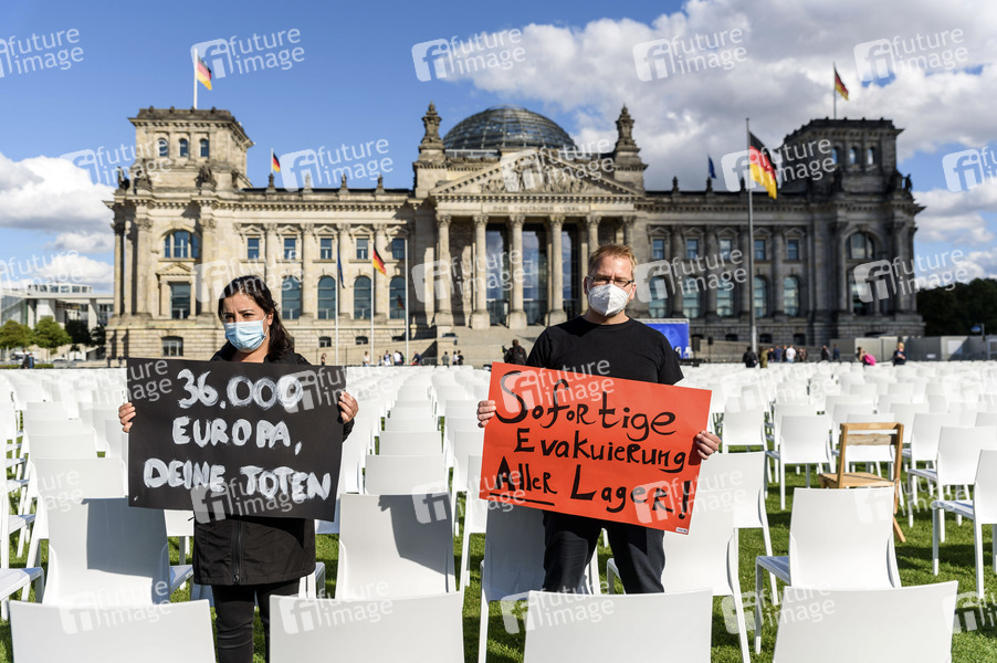 Unter dem Motto 'Wir haben Platz' stehen 13000 leere Stühle vor dem Berliner Reichstag. Mit die Aktion fordern unter anderem die Aktion Seebrücke und CAMPACT die Evakuierung griechischer Flüchtinglager und die Aufnahme von Geflüchteten. Die Stühle stehen stellvertretend für die 13000 Flüchtlinge im Flüchtingslager Moria. Berlin, 07.09.2020