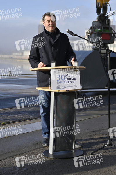 Markus Söder bei der Jubiläumsveranstaltung '30 Jahre Main-Donau-Kanal' am Bamberger Hafen. Bamberg, 25.11.2022
