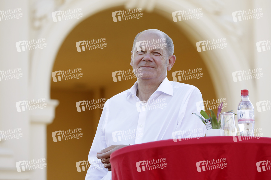 Olaf Scholz bei einem öffentlichen Bürgergespräch vor dem Brandenburger Tor. Potsdam, 30.07.2021