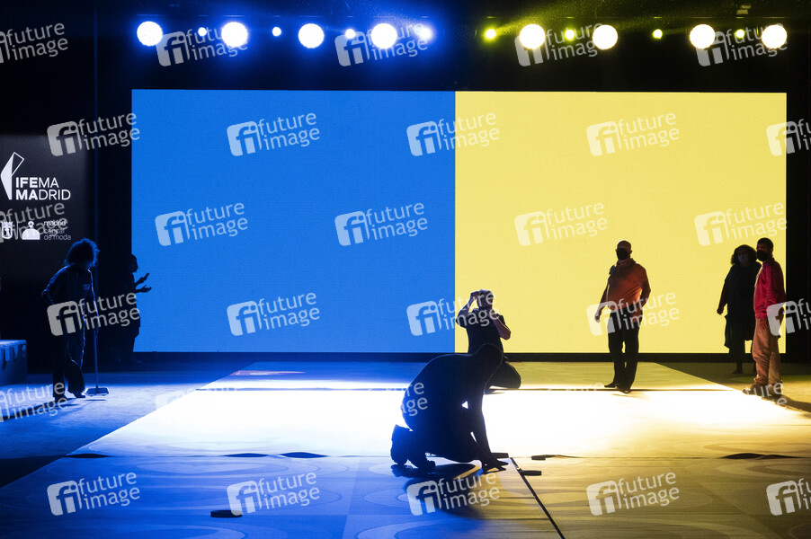 Ukraine Fahne bei der Agatha Ruiz de la Prada Fashion Show auf der 75. Mercedes-Benz Fashion Week Madrid auf dem Messegelände Ifema.. Madrid, 10.03.2022