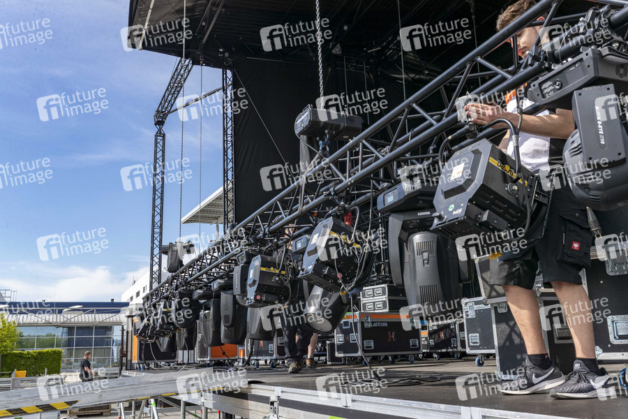 Die Bühne für die Autokonzert-Reihe an der Messe Erfurt wird aufgebaut. Die Eventreihe findet mit fünf Konzerten vom 20. bis 24. Mai 2020 statt. Erfurt, 18.05.2020