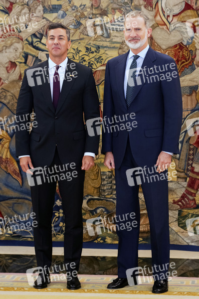 Politik, Staatsbesuch, Staatsvisite, Gespräch, bilaterale Gespräche, Treffen, Diplomatie, Staatsgast, Politiker, Staatspräsident von Paraguay, Santiago Peña Palacios, Adel, König von Spanien, Staatsoberhaupt, Fürst von Asturien, Fürst von Girona, Felipe de Borbón, Monarch, Royal