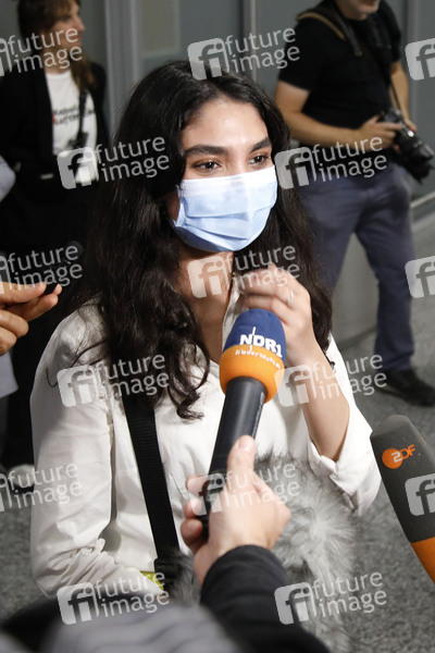 Menschen aus Afghanistan, die zuvor mit einem Flugzeug auf dem Flughafen Hannover-Langenhagen gelandet sind, sprechen zu Pressevertretern. Nach monatelanger Wartezeit sind mehrere Familien mit Aufnahmezusage in Deutschland angekommen. Hannover, 01.09.2025