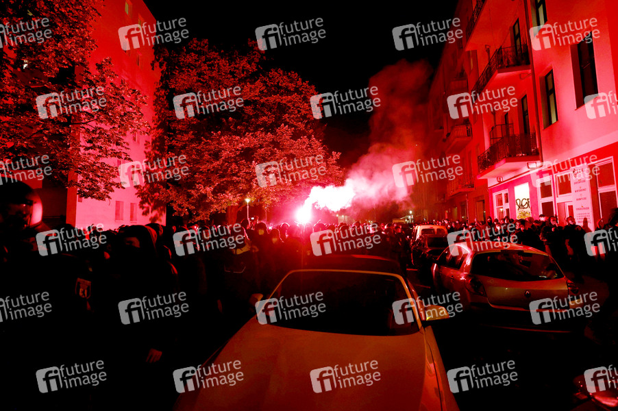 Bei einer Demo gegen die Räumung des linksautonomen Bauwagen-Camps 'Köpi' in Berlin-Kreuzberg ist es zu Ausschreitungen gekommen. Dabei wurden Polizisten mit Flaschen, Steinen und Feuerwerkskörpern beworfen. Unbekannte haben in der Reichenbergerstraße Scheiben mehrerer Autos zerschlagen, Verkehrsschilder in parkende Autos gerammt und Dixieklos umgeschubst. Laut Polizei waren 7.000 bis 8.000 Teilnehmer vor Ort. Berlin, 15.10.2021