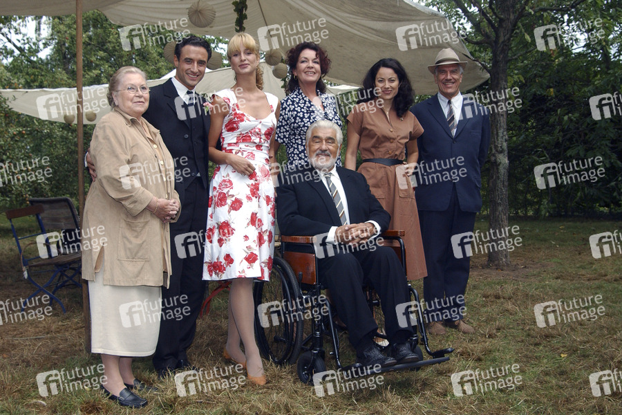 Eva Maria Bauer, Gunther Gillian, Lara Joy Körner, Elisabeth Trissenaar, Mario Adorf, Carolina Vera Squella und Urs Hefti beim Fototermin am Set des ARD-Fernsehfilms 'Vera - Die Frau des Sizilianers'. Meerbusch, 09.01.2003