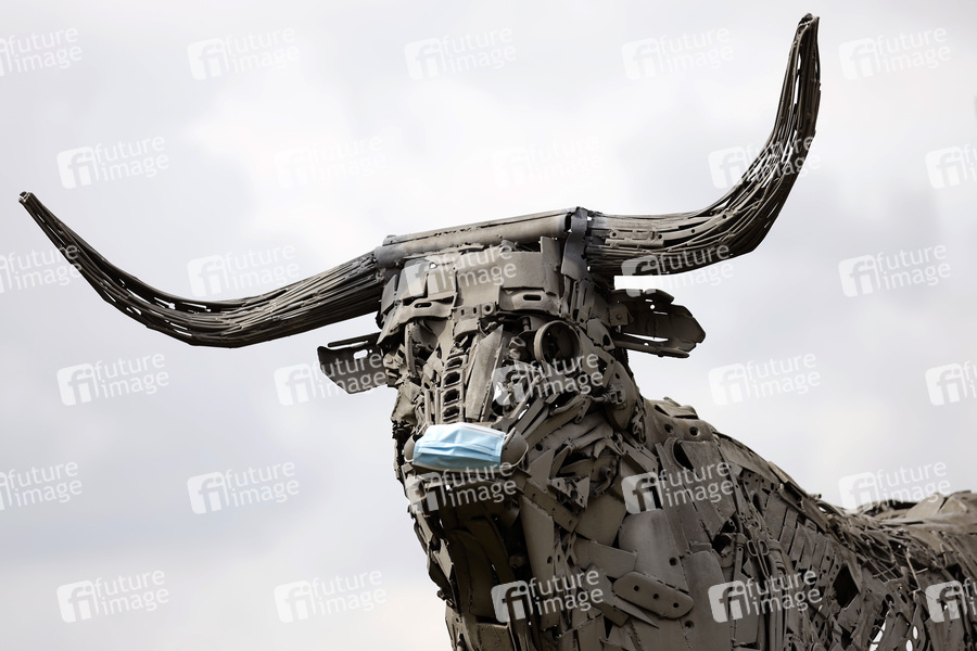 Schlachter, Schlachtbetrieb, Schlacht, Tiere, Kuh, Rind, Stier, MNS, Mund-Nasen-Schutz, Atemmaske, Schutzmaske, Schwein, Schweinefleisch, Rindfleisch, Steak, Schnitzel, Döner, Fleisch, Fleischindustrie, Schlachtung, Fleischverarbeitung, Werkverträge, Tierschutz, Zerlegung, Lebensmittel, Fleisch essen, Lebensmittelindustrie, Tönnies-Logo, Tönnies, Toennies, Tönnies-Arena, Kühlkette, Kühlwagen, Hauptwerk, Tiertransporte, Corona, Virus, Coronavirus, Coronakrise, Corona-Krise, Coronainfektionen, Infektionen, Neuinfektionen, Fleischerhandwerk, Corona-Ausbruch, Ausbruch, Hygiene, Skulpturen, Figuren, Maske, Maskenpflicht, Fleischskandal, Fleisch-Skandal, Symbolbild, Symbolfoto
