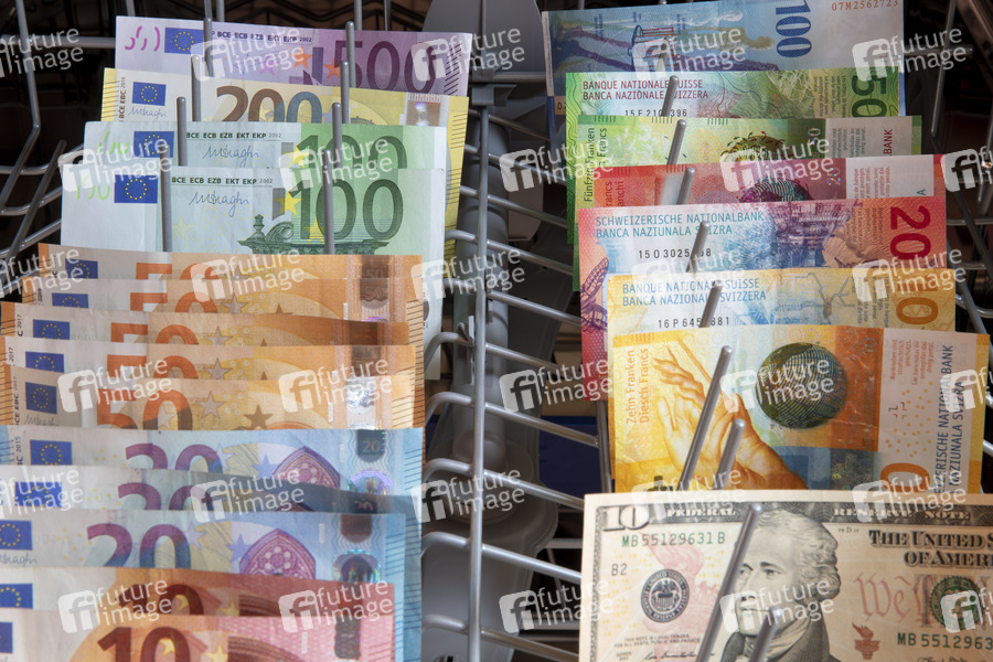EURO, Schweizer Franken und Dollar Banknoten in einer Geschirrspülmaschine
