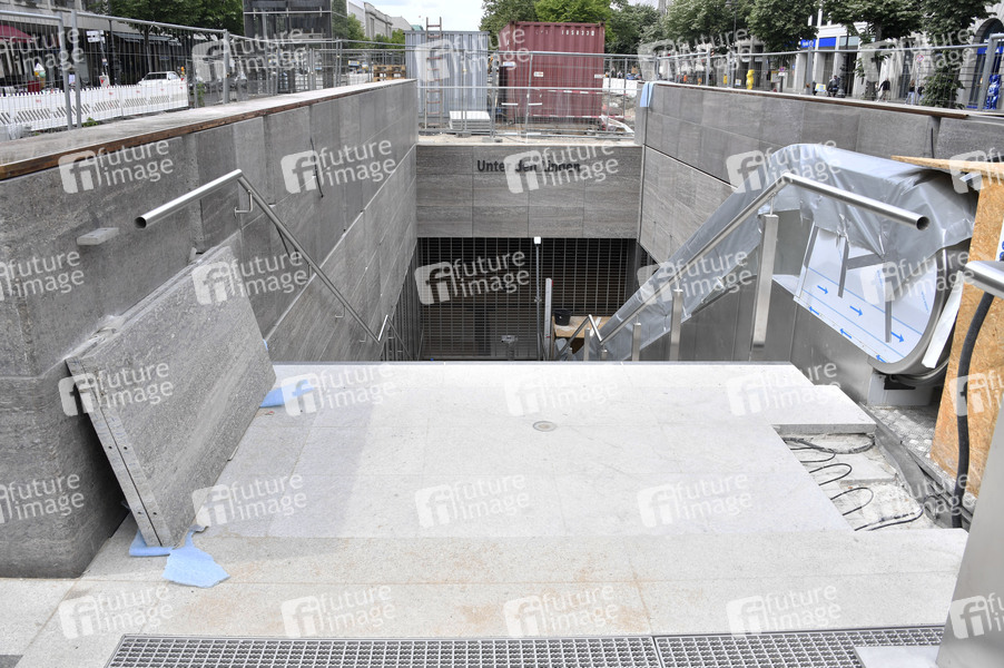 Einblick in den neuen U-Bahnhof Unter den Linden der Linie U5 von der Mittelinsel der Kreuzung Friedrichstraße / Unter den Linden. Der U-Bahnhof ist fast fertig. Die Containerburgen und die festen Bauzäune wurden zurückgebaut. Berlin, 24.05.2020
