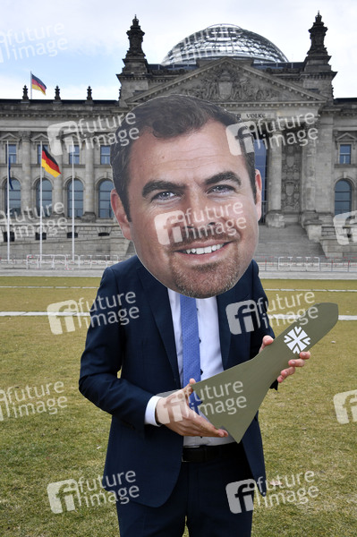 Aktivisten mit Masken von Drohnen-Befürwortern und der 'Eurodrohne' bei der Fotoaktion 'Keine Kampfdrohnen für die Bundeswehr!' vor dem Bundestagsgebäude. Berlin, 18.03.2021