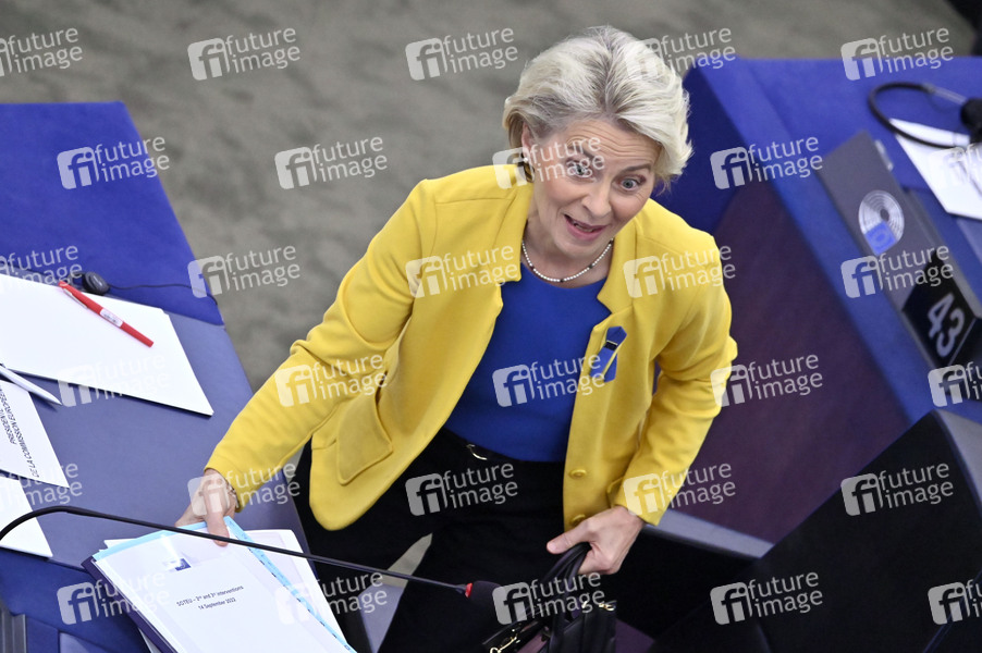 Ursula von der Leyen nach ihrer Rede zur Lage der EU im Plenarsaal des Europäischen Parlaments mit deutlichen Worten zu Russland. Sie lobte auch den Mut der Ukrainer und die Solidarität der Europäer mit ihnen. Straßburg, 14.09.2022