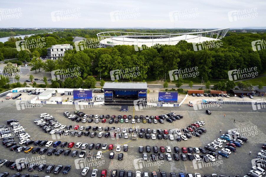 Zuschauer, Lufaufnahme, Luftbild, Auftritt, Bühne, Stage, live, Unterhaltung, Entertainment, Kultur, Corona, Sars-CoV-2, Covid-19, Coronavirus, Coronakrise, Corona-Krise, Corona-Pandemie, Coronamaßnahmen, Corona-Schutz, Kontaktverbot, Mindestabstand, Social Distancing, Abstand, Abstandhalten, Abstandsregel, Auto, Autokonzertreihe