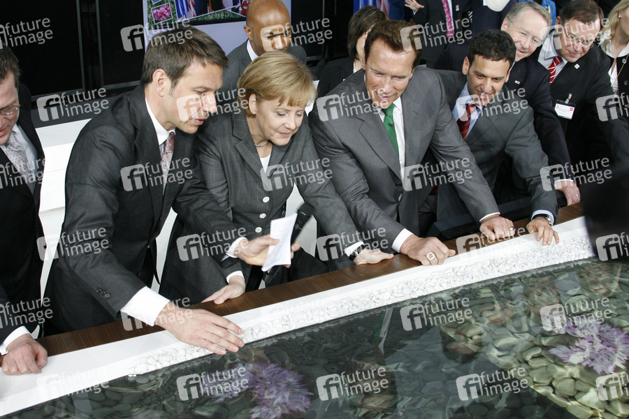 Eröffnungsrundgang von Bundeskanzlerin Merkel und Gouverneur Schwarzenegger auf der CeBIT 2009 (Centrum der Büro- und Informationstechnik), der weltgrößten Messe für Informations- und Computertechnik auf dem Messegelände in Hannover. Auf dem Stand der Deutschen Telekom