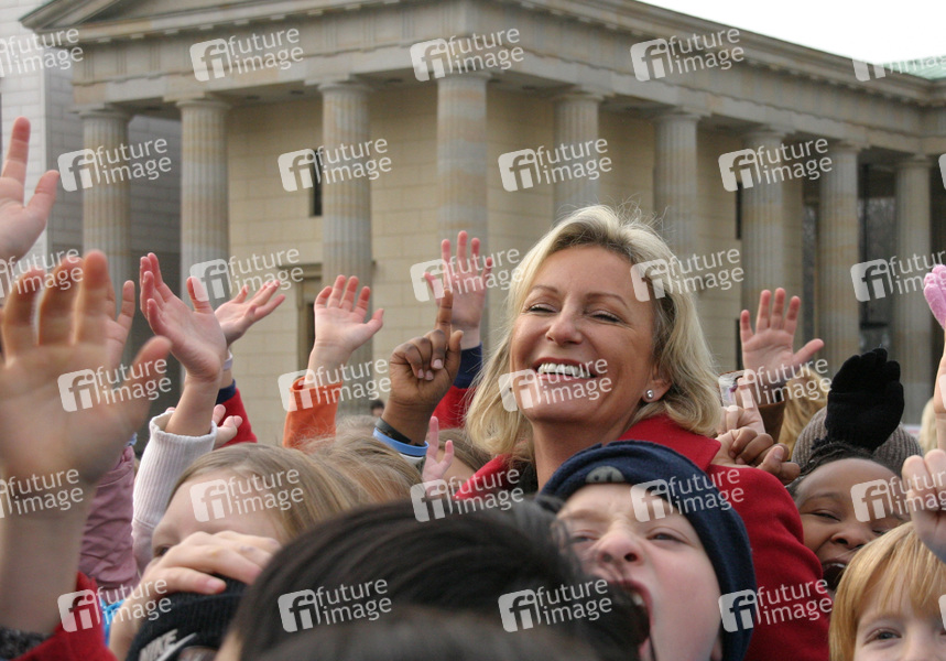 UNICEF Fototermin mit Sabine Christiansen und 90 Schülern und Schülerinnen der Internationalen Schule Berlin vor dem Banner 'A Call From Berlin: Children First - Kinder haben Rechte' am Brandenburger Tor