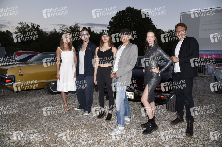 Anabell Grieß-Nega, Albert Feil, Sarah Riesz, Klaus Lemke, Emma-Lynn Mainzer und Christoph Gröner bei der Premiere des Kinofilms 'Ein Callgirl für Geister' beim Filmfest München Pop-Up im PopUp Autokino auf dem Zenith Parkplatz. München, 23.08.2020