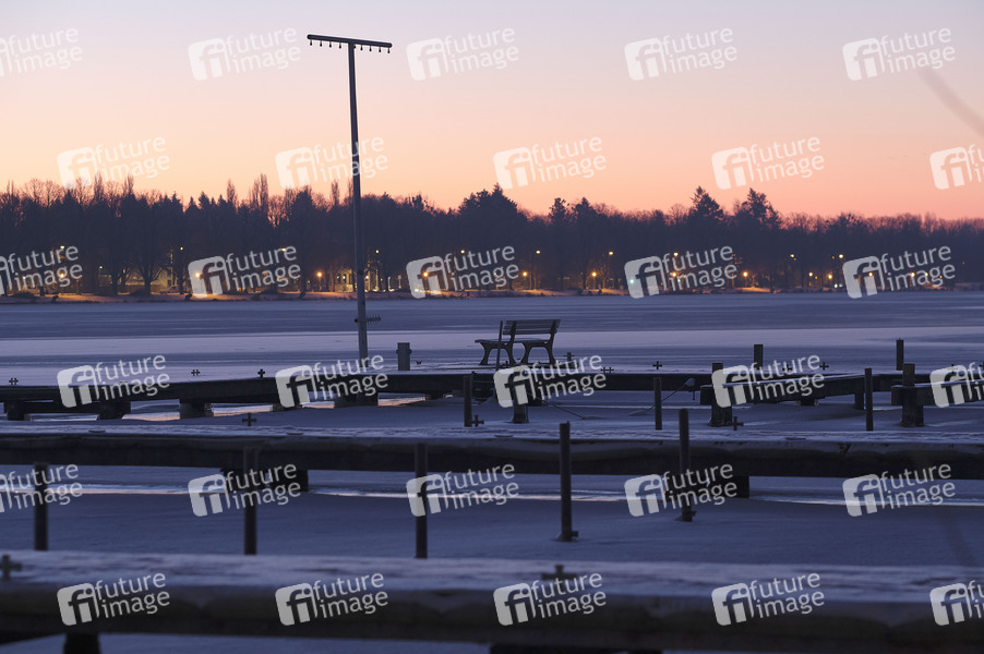 Zugefrorener Maschsee bei Sonnenaufgang im Winter. Hannover, 14.02.2021