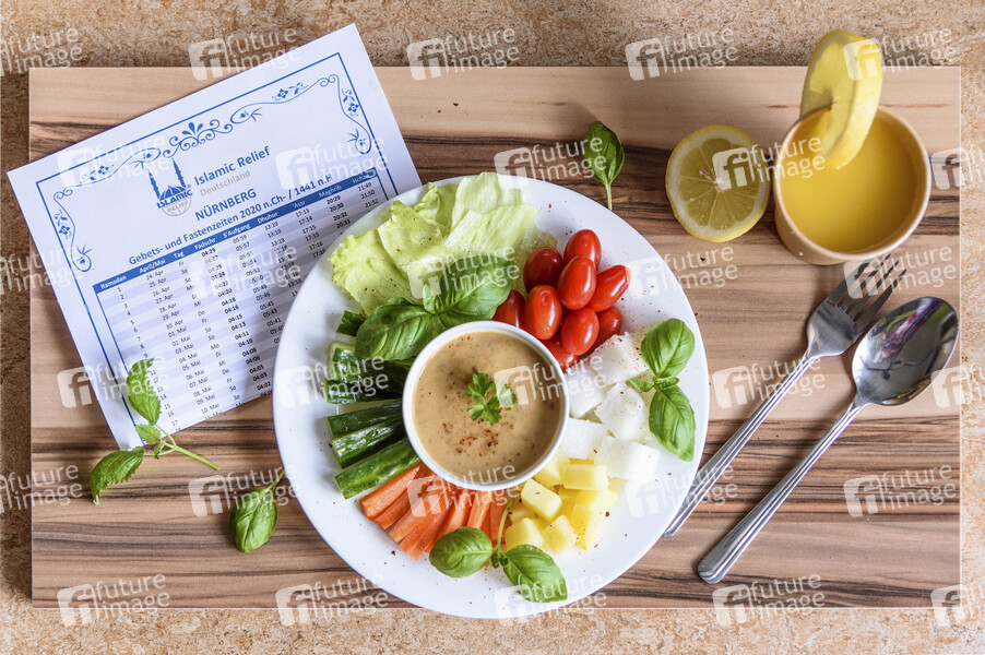 Ein Gericht mit Islamic Relief Fastenkalender 'Selbstdarstellung Gebets- und Fastenzeiten 2020 n.Chr. / 1441 n.H.' im Fastenmonat Ramadan
