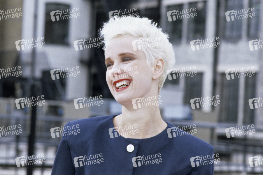 Paula Yates bei einer Modepräsentation auf einem Dach. London, 15.09.1987
