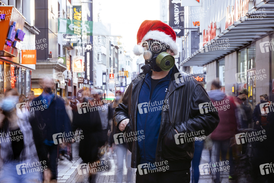 Ein Mann mit Gasmake und Nikolausmütze posiert in der Hohe Straße. In der Einkaufszone gilt wie auch in anderen Fußgängerzonen in Köln während der Coronakrise Maskenpflicht. (Themenbild, Symbolbild) Köln, 16.11.2020