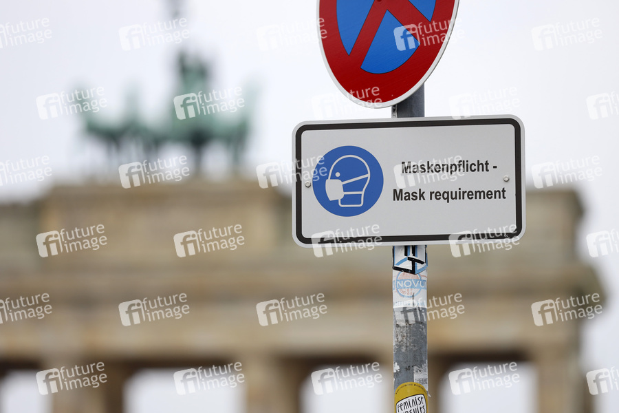 Harter Lockdown zu Ostern: Stimmen werden laut nach einem harten und konsequenten Lockdown. Es seien schärfere Corona-Maßnahmen nötig, um die Pandemie einzudämmen, meinen Ärzte wie Weltärztepräsident Montgomery. Im Bild ein Schild, welches auf Maskenpflicht am Pariser Platz vor dem Brandenburger Tor hinweist. (Themenbild, Symbolbild) Berlin, 31.01.2021