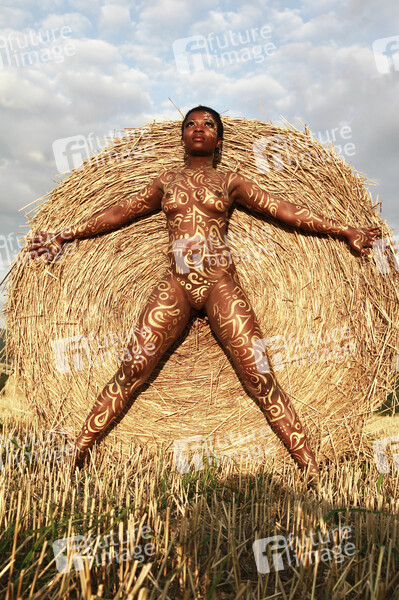 Bodypainting, Erotik, Frau, Mädchen, Afrikanerien, nackt, draußen, weiblich, Körperkunst, Kunst, Ornamente, Malerei, Feld, Acker, Stoppelfeld, Heuballen, Stroh, Landwirtschaft, Ernte, Abendsonne, erotic, African woman, girl, nude, outdoor, female, body art, body painting, ornaments, field, hay, straw, farming, harvest, evening sun