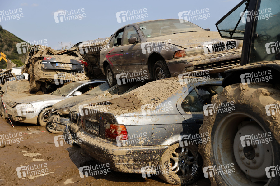 Nach dem Jahrhunderthochwasser in der Eifel durch heftige Regenfälle und Dauerregen mit Überschwemmungen und Überflutungen haben die Aufräumarbeiten im Ahrtal begonnen. Einheiten von Polizei, THW, Bundeswehr und Feuerwehr mitsamt vielen freiwilligen Helfern räumen Straßen, entfernen Schutt und Schlamm und versorgen die Menschen. Im Bild zerstörte Autos in der Ortschaft Dernau, in der die Flut viele Häuser zerstörte, 22.07.2021