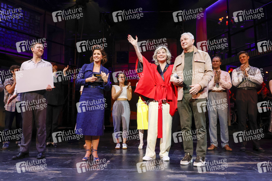 Judy Winter und Klaus Wowereit mit dem Ensemble des Musicals 'Ku'damm 59' bei der Spendenscheckübergabe zum Welt-Aids-Tag 2024 im Theater des Westens. Berlin, 30.11.2024