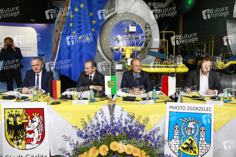 Thomas Schmidt, Octavian Ursu, Rafal Gronicz und Wolfram Günther bei der feierlichen Unterzeichnung des Letter of Intent 'Klimaneutrale Fernwärme für die Europastadt Görlitz/Zgorzelec' im BHKW Königshufen. Görlitz, 09.07.2020