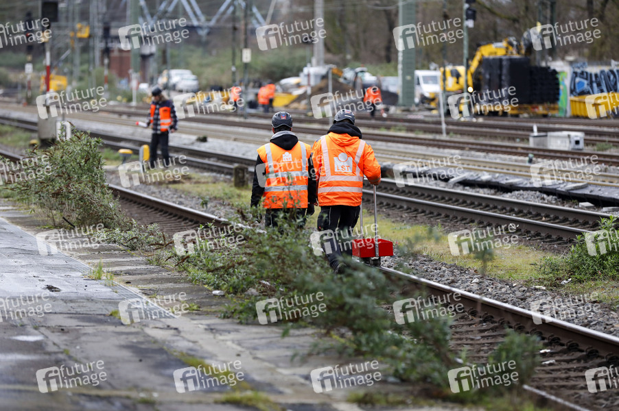 Gleisbauarbeiter beim Fototermin 'Endspurt für das Elektronische Stellwerk (ESTW) Linker Rhein' am Bahnhof Köln-West. Köln, 13.03.2024