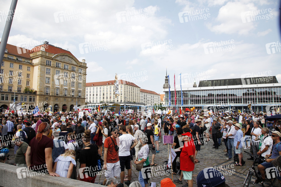 Demonstranten verschiedener Gruppen protestieren unter dem Motto 'Unteilbar: Für eine offene und freie Gesellschaft - Solidarität statt Ausgrenzung' gegen Rassismus, für soziale Gerechtigkeit und gegen Ausgrenzung am Altmarkt. Dresden, 24.08.2019