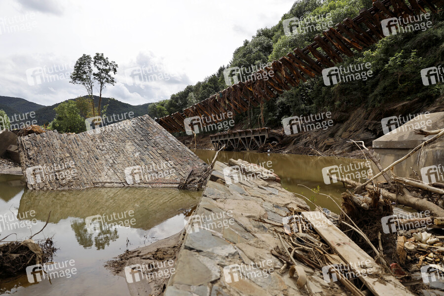Nach dem Jahrhunderthochwasser in der Eifel durch heftige Regenfälle und Dauerregen mit Überschwemmungen und Überflutungen haben die Aufräumarbeiten im Ahrtal große Fortschritte gemacht. Einheiten von Polizei, THW, Bundeswehr und Feuerwehr mitsamt vielen freiwilligen Helfern haben Straßen geräumt, Schutt und Schlamm entfernt und die Menschen versorgt. Der Wiederaufbau wird trotzdem Jahre dauern. Im Bild Flutschäden an einer Brücke zwischen Rech und Mayschoß, die durch die Flut beschädigt wurde, 08.08.2021