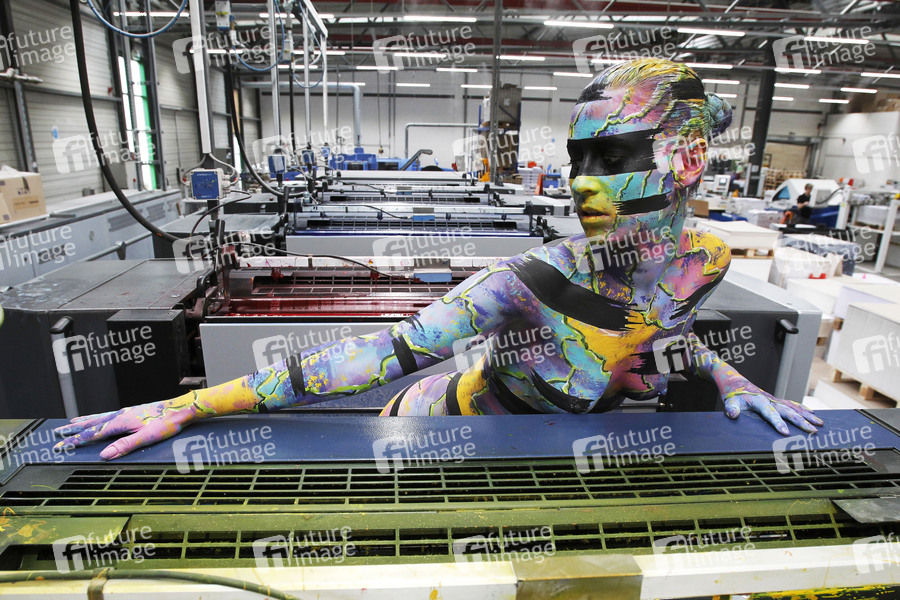 Jörg Düsterwald, einer der bekanntesten Bodypainting- und Bodyartkünstler Deutschlands macht auf seine ganz eigene Art auf die prekäre Situation freischaffender Künstler während der Corona-Pandemie aufmerksam: Unter dem Hashtag #WirzeigenFarbe hat der Hamelner Künstler in der Produktionshalle der Druckerei QUBUS media mit seinem Model Lisa ein ausdruckstarkes Live-Bodypainting inszeniert - denn Künstlerinnen und Künstler wie er sehen und fühlen sich derzeit wortwörtlich 'ausgezogen bis aufs letzte Hemd'. Und nichts symbolisiert diesen bekannten Spruch besser als ein Bodypainting auf nackter Haut in einer Umgebung, in der es jeden Tag um Farbe geht. Die Live-Performance fand mit dem zeitgleichen Druckstart von Jörg Düsterwald's neuem Premiumkalender 'Bodypainting in Nature 2021' statt. Hannover, 14.07.2020
